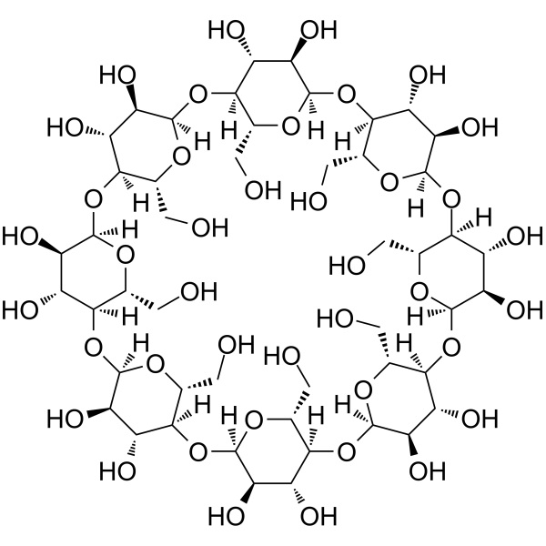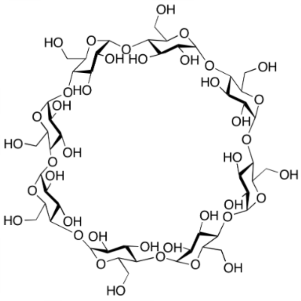 Циклодекстрины представляют собой белые мелкокристаллические порошки практически без запаха, имеющие слегка сладковатый вкус. Некоторые производные циклодекстрина встречаются в виде аморфных порошков. γ-Циклодекстрин (CAS:17465-86-0) является одной из трех распространенных форм циклодекстринов. Соединение состоит из восьми единиц глюкозы и имеет форму полого усеченного конуса с гидрофильной внешней и гидрофобной внутренней частью. Из-за большего количества единиц глюкозы это соединение более предпочтительно, чем аналоги α-Циклодекстрина (CAS: 10016-20-3) и β-Циклодекстрина (CAS: 7585-39-9), и может образовывать тельца включения со стероидами и макроциклами. Благодаря гибкости γ-циклодекстрина и некомпланарной структуре соединение имеет растворимость 232 г/л, 25°C. Соединение также может расщепляться амилазой как слюны, так и поджелудочной железы, в отличие от α-Циклодекстрина и β-Циклодекстрина.