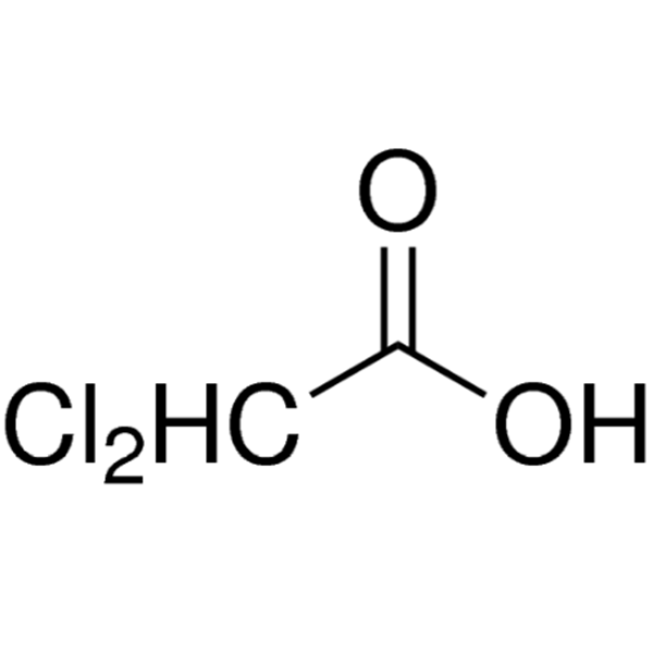 Дихлоруксусная кислота (CAS: 79-43-6) представляет собой простое соединение галогенированной уксусной кислоты с двумя хлоридами в α-положении. представляет собой едкую, горючую, бесцветную, сильную жидкую кислоту с резким запахом. Он растворим в воде и спирте. Дихлоруксусная кислота (Ka=5,14×10-2) является более сильной кислотой, чем хлоруксусная. Большинство химических реакций аналогичны реакциям хлоруксусной кислоты, хотя в реакцию вступают оба атома хлора. Дихлоруксусная кислота гораздо более устойчива к гидролизу, чем хлоруксусная кислота. Это реакционноспособный промежуточный продукт органического синтеза. Дихлоруксусную кислоту получают хлорированием уксусной кислоты.