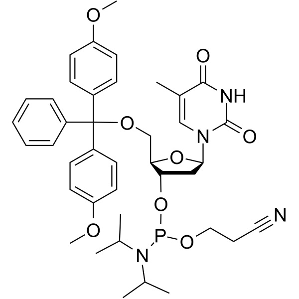 | Синонимы | 5'-O-DMT-Тимидин 3'-CE Фосфорамидит; 5'-O-DMT-2'-дезокситимидин-3'-CE фосфорамидит; 5'-Диметокситритил-3'-Дезокситимидин 2'-[(2-Цианоэтил)-(N,N-Диизопропил)]-Фосфорамидит; 5'-O-(4,4'-диметокситритил)-2'-дезокситимидин-3'-(2-цианоэтил-N,N-диизопропил)фосфорамидит; 5'-O-[Бис(4-Метоксифенил)(фенил)метил]-3'-O-[(2-Цианоэтокси)(диизопропиламино)фосфино]тимидин; 5'-O-[Бис(4-Метоксифенил)PhMe]-Тимидин 3'-[2-Цианоэтил N,N-бис(1-Метилэтил)фосфорамидит] |