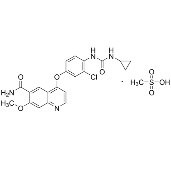 Ленватиниба мезилат (CAS: 857890-39-2) представляет собой пероральный многоцелевой ингибитор VEGFR1-3, FGFR1-4, PDGFR, KIT и RET, обладающий мощной противоопухолевой активностью. Ленватиниба мезилат представляет собой ингибитор рецепторной тирозинкиназы (RTK), обладающий селективностью в отношении VEGFR2. Он проявляет противоопухолевую активность и показан для лечения пациентов с местно-рецидивирующим или метастатическим, прогрессирующим, резистентным к радиоактивному йоду (RAI) дифференцированным раком щитовидной железы. Ленватиниба мезилат был впервые одобрен Управлением по санитарному надзору за качеством пищевых продуктов и медикаментов США (FDA) 13 февраля 2015 г., затем одобрен Агентством по фармацевтике и медицинскому оборудованию Японии (PMDA) 26 марта 2015 г. и одобрен Европейским медицинским агентством (EMA) 28 мая 2015 г. Он был разработан и продается под названием Lenvima® компанией Eisai. Ленватиниба мезилат представляет собой пероральный ингибитор множественных рецепторов тирозинкиназы с уникальным способом связывания, который избирательно ингибирует киназную активность рецепторов фактора роста эндотелия сосудов (VEGF), в дополнение к другим тирозинкиназам, связанным с проангиогенным и онкогенным путем, которые, как считается, участвуют в пролиферации опухоли. Он показан для лечения прогрессирующего дифференцированного рака щитовидной железы, рефрактерного к радиойоду. Ленвима используется сам по себе для лечения дифференцированного рака щитовидной железы (DTC), типа рака щитовидной железы, который больше не поддается лечению радиоактивным йодом и прогрессирует. ЛЕНВИМА используется вместе с другим лекарством под названием эверолимус для лечения взрослых с типом рака почки, называемым распространенным почечно-клеточным раком (ПКР), после одного курса лечения другим противораковым лекарством.